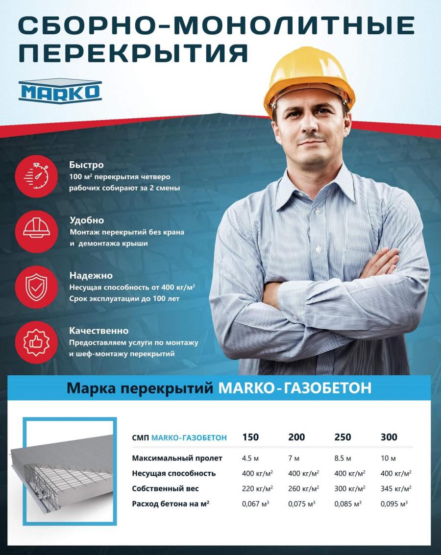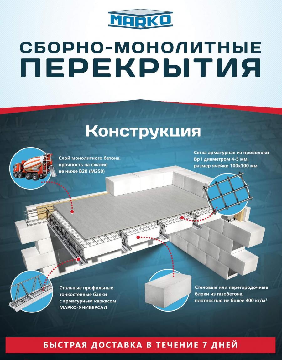 Сборно-монолитные перекрытия Марко-Газобетон — это современная модель перекрытия, которая имеет высокую несущую способность и небольшой вес. Монтаж такого перекрытия происходит очень быстро и легко.